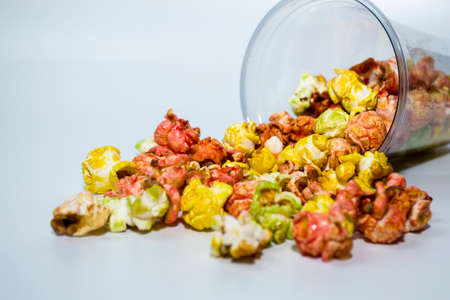 Brightly colored candied popcorn, white background, colored popcorn, colored background.