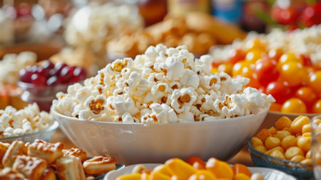 The table is adorned with a variety of small snacks and a large bowl of popcorn setting the scene for the upcoming movie night