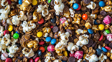 A colorful mix of popcorn and candies, delicious snack treat for any occasion.