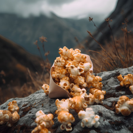 Popcorn in a paper bag on a stone in the mountains. Toned.