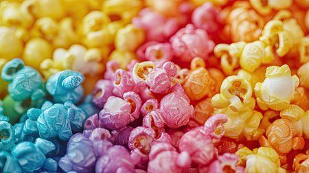 A vibrant close-up of rainbow-colored popcorn kernels, showcasing a fun and sweet twist on the traditional movie snack.