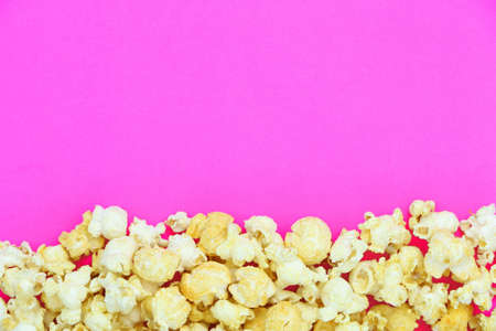 Salted popcorn mix with cheese popcorn frame on pink paper background, have copyspace for put text