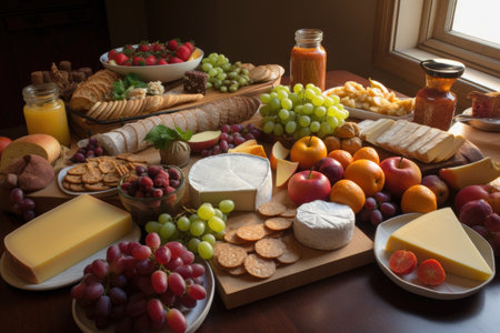 a spread of artisanal cheeses, fruits, and crackers, created with generative ai