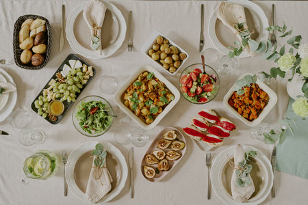 Overhead view showing table set for meal with plates, cutlery, glasses, napkins and various dishes including salad, potatoes, fruit, bread, vegetables, ready for group dining