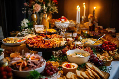 A full table of appetizers and snacks for guests at an event or gathering. Perfect for business meetings, weddings, and other occasions. The buffet features a variety of finger foods, including sandwiches, fruits, cheeses, and more