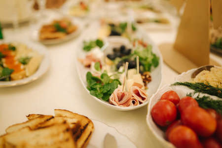 holiday table, food. Table at restaurant in process of celebrating. Cheese, salads. Started dishes. Top view