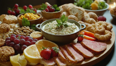 Rustic Gourmet Food Spread with Cheeses, Fruits, and Breads
