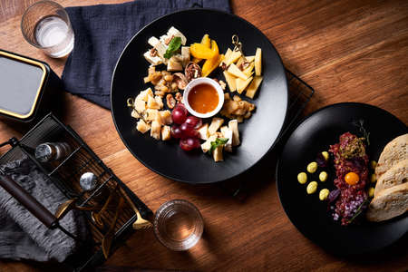 Cheese plate with honey and beef tartare on wooden table. Top view