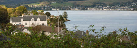 Panoramic view of the rocky shores and forests of a small village Ardrishaig. Loch Fyne, Crinan canal, Argyll and Bute, Scotland, UK