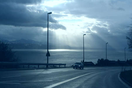 Panorama of the lake of Leman or Lac Leman on a cold winter night. Late night panorama of Lac Leman.
