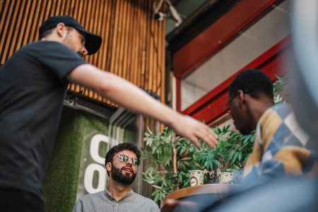 Group of multi ethnic youngsters chilling in urban outdoor background
