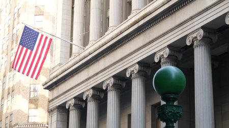 New York City United States. Manhattan Downtown Financial District architecture. American Flag on Wall street near Stock Exchange building, USA Stock Market. Hot steam smoke. Subway metro orb globe.