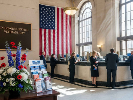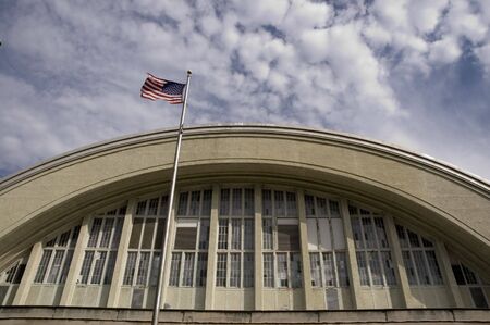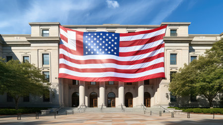 A grand American flag, representing freedom and unity, elegantly dances in the breeze in front of a sleek glass building, its stars and stripes boldly standing out under the radiant sun