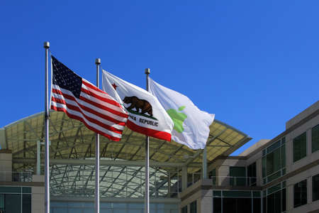 Cupertino, CA, USA - September 17, 2013: Daylight photo of the three flags at the main entrance of Apple, Inc. From left to right, flags are USA, State of California, and Apple company logo.