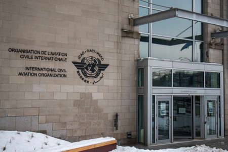 The front entrance to the headquarters of the International Civil Aviation Organization (ICAO), offices at 999 Boulevard Robert-Bourassa in Montreal.