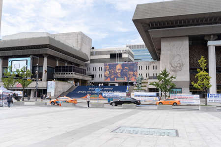 Seoul, South Korea, September 17 2019, View at famous touristic empty street with tall famous buildings.