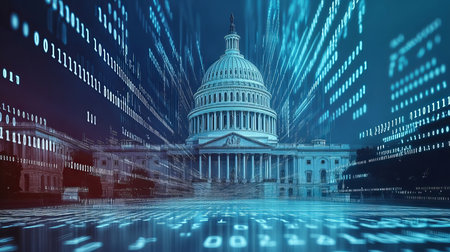 A striking digital image that merges the U.S. Capitol with flowing binary code, showcasing the significant impact of modern technology on government, society, and politics in our evolving world