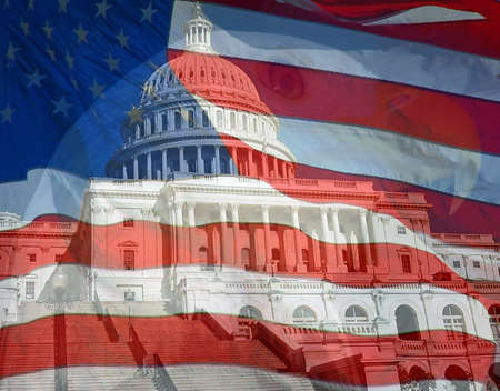 Washington DC Capitol dome. Congress and Senate Capitol building. USA flag over Capitol dome. Election day in Washington. American Capitol. Congress and Senate in USA.