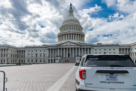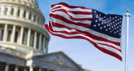 Washington, DC, USA - August 26, 2025: big US Flag with the capitol structure behind in washington dc