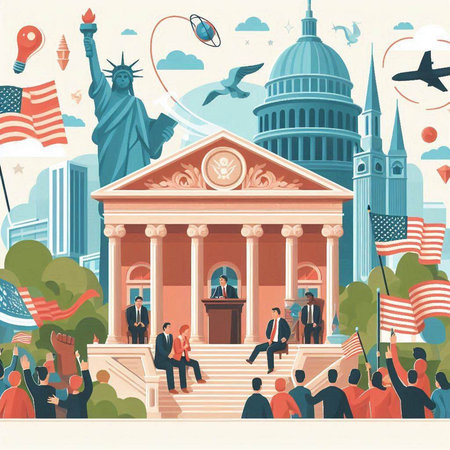 Flat design vector illustration of United States Capitol building, Statue of Liberty and crowd of people.