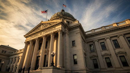 A large, classical building featuring a prominent dome stands under a bright blue sky dotted with puffy white clouds. The exterior showcases a symmetrical design with columns. The architecture appears to be of historic significance, suitable for commercial and editorial purposes, conveying power and authority.