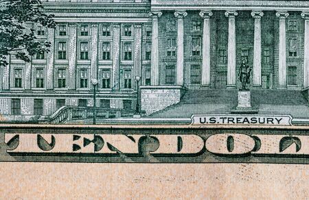 Selective focus on detail of 10 dollars banknote. Close up macro detail of money banknotes, dollars isolated. World money concept, inflation and economy concept