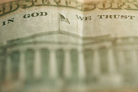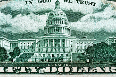 Extreme closeup of United States Capitol depicted on 50 USD bill reverse with the words In God We Trust. Shallow depth of field