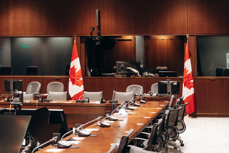Ottawa, Canada - August 13, 2025: Modern Senate of Canada committee room with long wooden tables, microphones, grey chairs, and two Canadian flags in a conference setup.