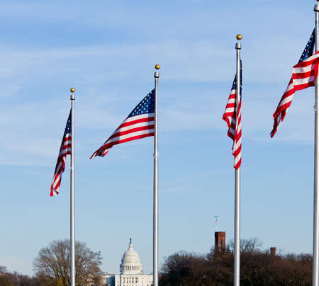 USA Washington DC Capitol detail with waving American flag, blue sky