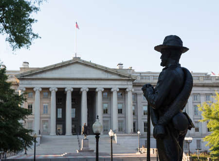 Washington DC--Aug 18, 2018; bronze doors, seals and words on building mark entrance to the United States Department of Treasury.