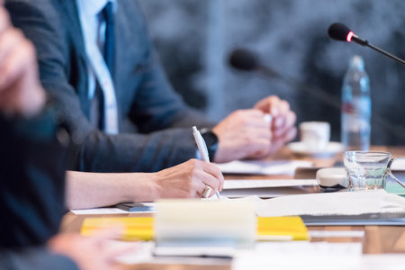Close-up photo of businessmen who are at a meeting and business meeting in a modern hall