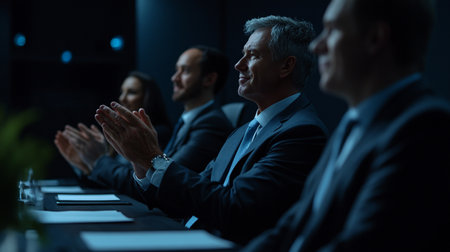 Business people applauding during a conference in the office at night.