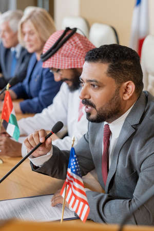 Group of international politicians sitting at table with national flags and listening to speech of Islamic representative in ghutrah at conference