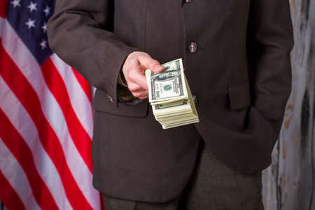 Man in suit holding dollars. USA flag, man and money. Such an interesting offer. I need powerful friends.