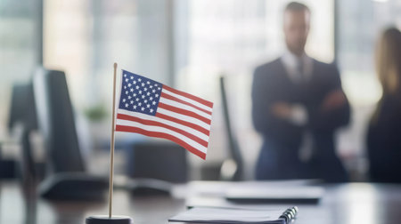 Close-up of a couple of lawyers signing a contract with the American flag in the background