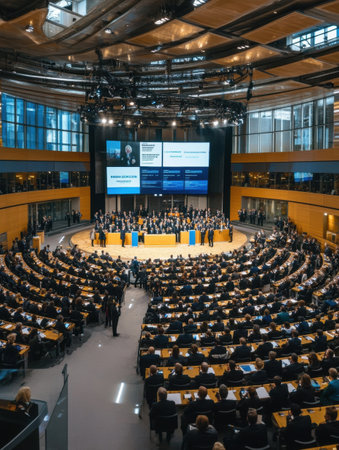 Attendees in a modern hall focus on key presentations and discuss important political matters displayed on large screens.