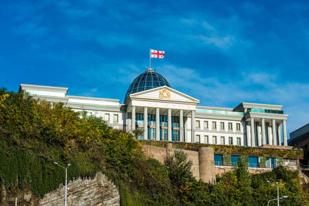 National and royal flags of Thailand flown at the front of the Government House of Thailand, in Bangkok.