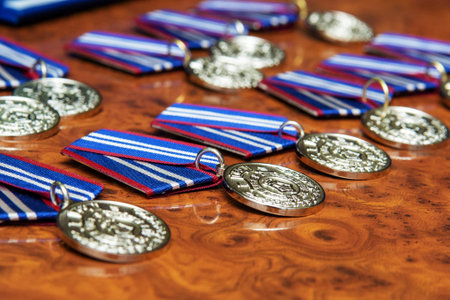 Moscow, Russia -March 27, 2019: Two medals of the Russian National Guard lie on the table. Medals awaiting delivery