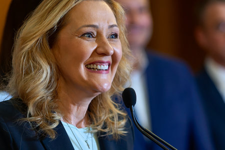 A poised woman addresses media representatives amid a sophisticated indoor environment, exuding authority with a calm, assured demeanor as journalists listen attentively.
