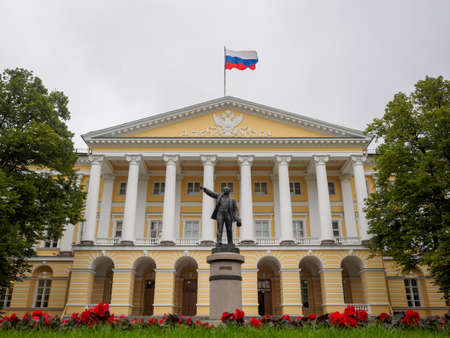 Facade of the Smolny Institute (the official residence of the governor of St.Peterburg now) with a Lenin statue in the foreground. Russia.