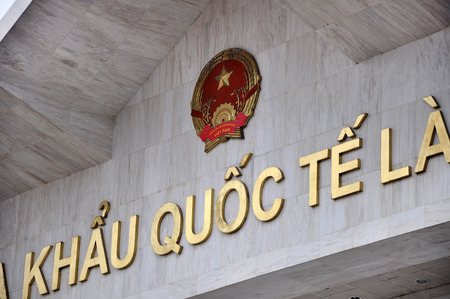 LAO CAI, VIETNAM - FEBRUARY 23, 2013: The border between Vietnam and China in Lao Cai across the Red River is crossed every day by hundreds of locals and tourists