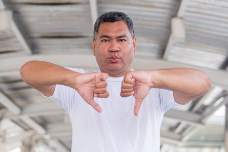 asian old senior man pointing thumb down hand gesture
