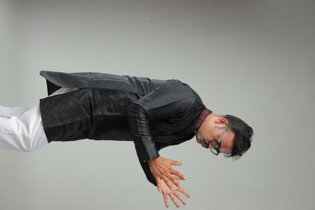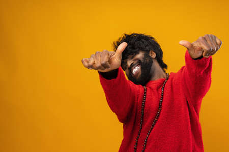Smiling person having fun, dancing on rhythm, enjoying relaxation time. Jolly indian man goofing around, entertaining himself doing funky movements, isolated over studio background, camera A