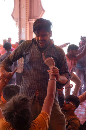 Jodhpur, rajastha, india - March 20, 2020: People Performing lord krishna and and gopi sattriya dance, happy janmashtami festival concept background, playing holi.