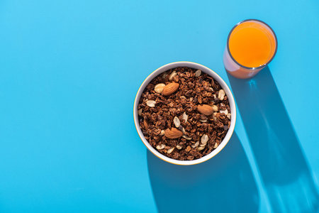 Granola with almond and peanut in orange bowl and carrot juice on a blue background. Top view.