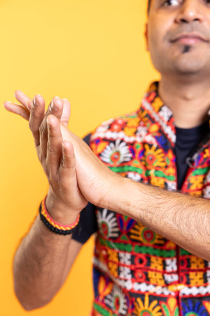 Bearded south asian man making prayer gesture while looking at camera isolated over yellow wall