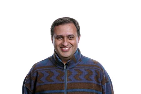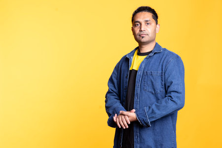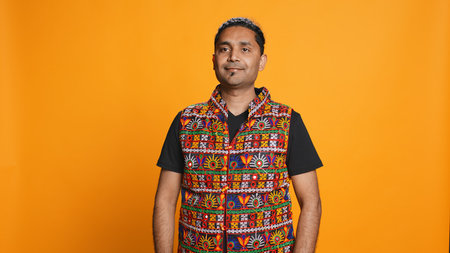 Portrait of optimistic indian man wearing colorful vest with positive facial expression smiling, looking pleased. Calm person in traditional clothing, feeling satisfied, studio backdrop, camera B