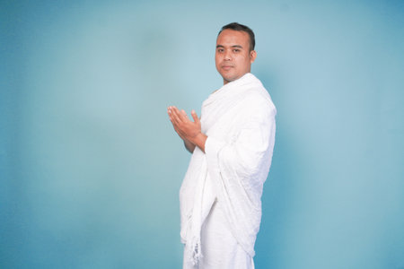 young Asian Muslim man wearing ihram posing praying and lifting head up over isolated blue background. Hajj concept. islam