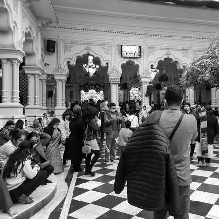 Vrindavan, India, February 12 2022 - Pilgrims in ISCON temple during the sacred month of Kartika, Inside view of Vrindavan ISKON temple during Ekadashi festival when devotee gather Black and White