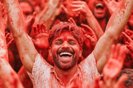 Joyful celebration during a vibrant Holi festival with a man covered in colorful powders, expressing happiness amidst a crowd, embodying festive spirit and cultural heritage